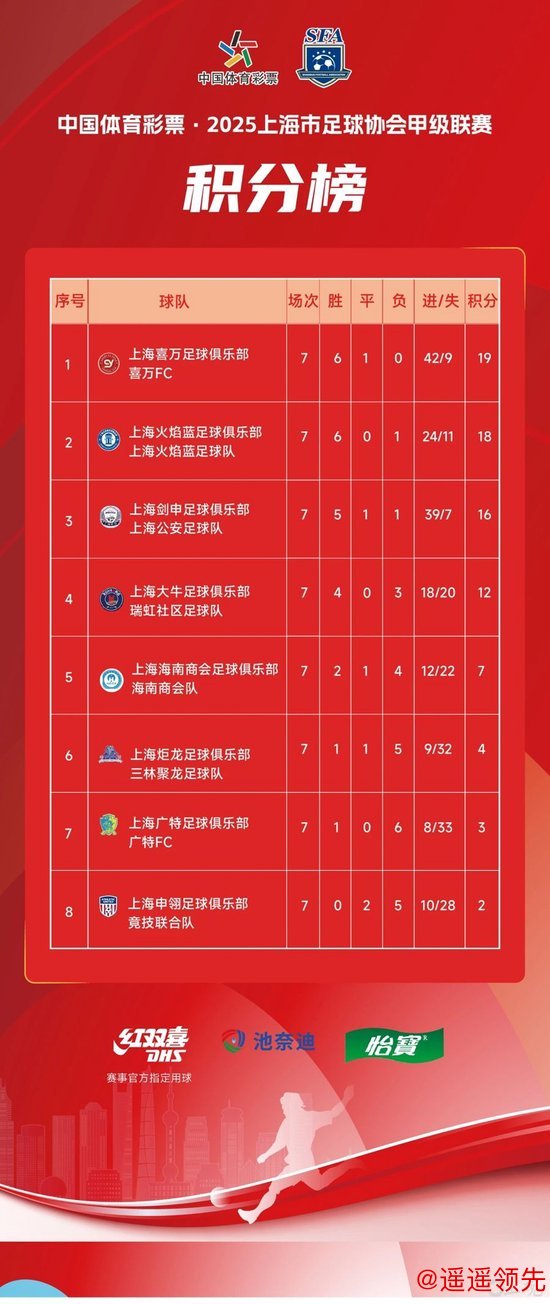 2025年上海市足球协会甲级联赛近日在上海市民体育公园·足球公园落幕,在夺冠焦点战中,上海喜万FC队以4比2的比分战胜上海火焰蓝足球队,最终以1分优势逆转称霸。作为“上甲”新科冠军,上海喜万FC队下赛季将晋升到“上超”联赛征战;作为第二名的上海火焰蓝足球队获得半个“上超”名额,他们将和今年“上超”联赛倒数第二名的球队抢夺最后一张“上超”入场券。
